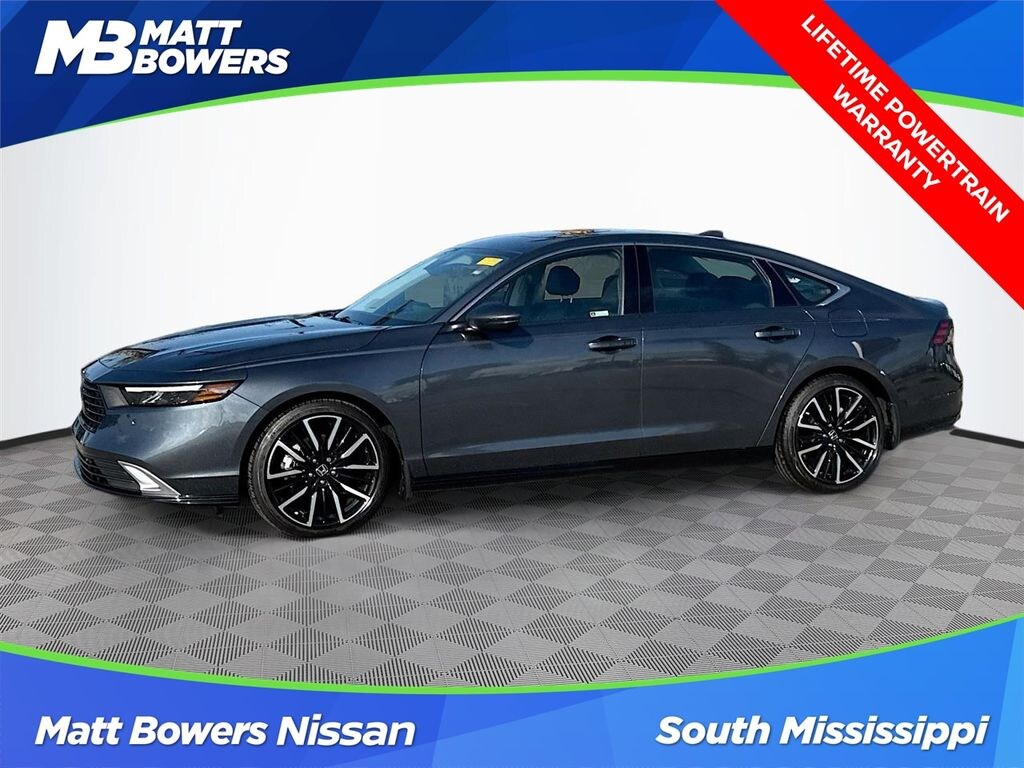 Matt Bowers Nissan of South Mississippi is proud to offer this outstanding 2023 Honda Accord Hybrid in Black This vehicle has passed our comprehensive inspection with flying colors and comes with the following features; 2.0L 16V DOHC, 12 Speakers, 4-Wheel Disc Brakes, ABS brakes, Adaptive Cruise Control: Adaptive Cruise Control (ACC) with Low-Speed Follow, Adaptive suspension, Air Conditioning, Alloy wheels, AM/FM radio, Apple CarPlay/Android Auto, Auto High-beam Headlights, Auto-dimming Rear-View mirror, Automatic temperature control, Bose Premium Sound System, Brake assist, Bumpers: body-color, Compass, Delay-off headlights, Driver door bin, Driver vanity mirror, Dual front impact airbags, Dual front side impact airbags, Electronic Stability Control, Emergency communication system: HondaLink, Exterior Parking Camera Rear, Four wheel independent suspension, Front anti-roll bar, Front Bucket Seats, Front Center Armrest, Front dual zone A/C, Front reading lights, Fully automatic headlights, Heads-Up Display, Heated & Ventilated Front Bucket Seats, Heated door mirrors, Heated front seats, Heated rear seats, Illuminated entry, Knee airbag, Lane departure: Lane Keeping Assist System (LKAS) active, Leather Shift Knob, Leather steering wheel, Leather-Trimmed Seat Trim, Low tire pressure warning, Memory seat, Navigation system: Google Built-In, Occupant sensing airbag, Outside temperature display, Overhead airbag, Overhead console, Panic alarm, Passenger door bin, Passenger vanity mirror, Power door mirrors, Power driver seat, Power moonroof, Power passenger seat, Power steering, Power windows, Radio data system, Rain sensing wipers, Rear anti-roll bar, Rear reading lights, Rear seat center armrest, Rear side impact airbag, Rear window defroster, Remote keyless entry, Security system, Speed control, Speed-sensing steering, Speed-Sensitive Wipers, Split folding rear seat, Steering wheel mounted audio controls, Telescoping steering wheel, Tilt steering wheel, Traction control, Trip computer, Turn signal indicator mirrors, Variably intermittent wipers, Ventilated front seats, and Wheels: 19" x 8.5J Berlina Black. 2.0L 16V DOHC.